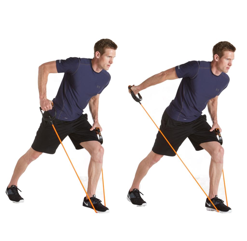 Puxe o elástico com os cotovelos flexionados em direção aos seus quadris;